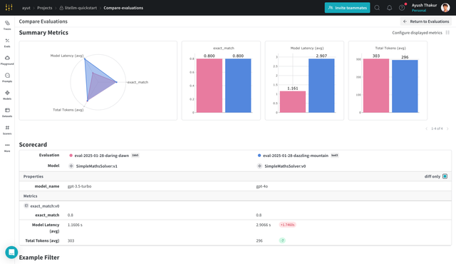 Now say you want to compare the performance of your current model with a different model using the comparison feature in the UI. LiteLLM's flexibility allows you to do this easily and W&B Weave evaluation pipeline will help you do this in a structured way.