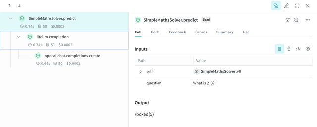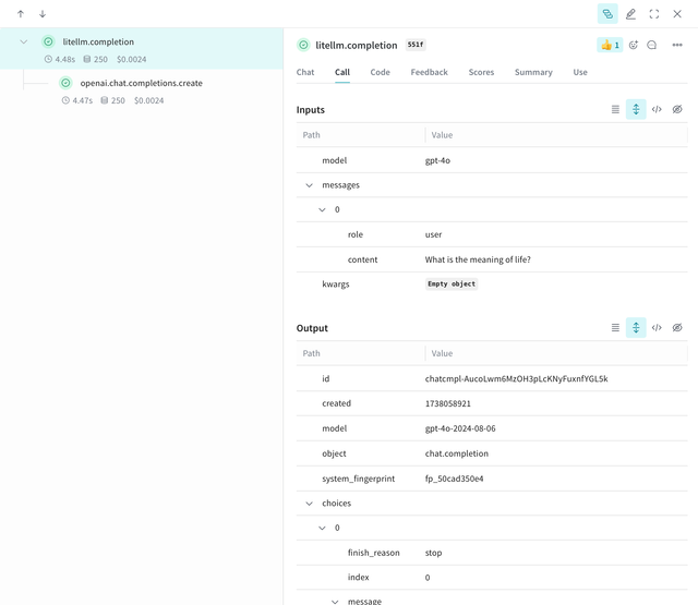 Since the underlying LiteLLM calls are automatically traced, you can see a nested trace of the LiteLLM call(s) made with details like the model, cost, token usage, etc.