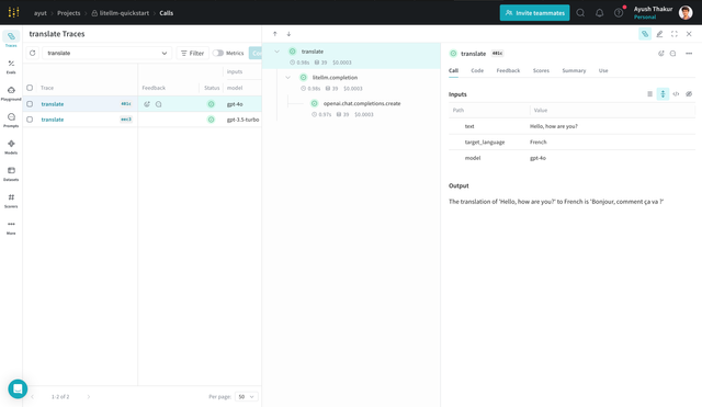 Now let's use LiteLLM and W&B Weave to build a simple LLM application to translate text from source language to target language.